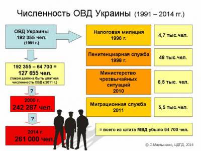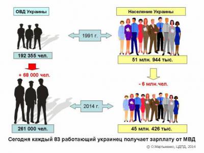 Таким же эволюционным порядком произошло увеличение общей численности кадров ОВД Украины – с 192 355 чел. в 1991 г. до 261 000 чел. в 2013 р. Как результат, в 2014 г. на 100 тыс. населения Украины приходилось 450 аттестованных сотрудников, способных выполнять функцию охраны общественного порядка с применением табельного оружия и спецсредств. Этот показатель в 1,5 раза превышал среднеевропейский показатель (300 полицейских на 100 тыс. населения) и вдвое превышал численность, предусмотренную рекомендациями ООН (222 полицейских на 100 тыс. населения). При 21 млн. 840 тыс. чел. Экономически активного населения это означало, что каждый 83 работающий житель получает зарплату от МВД Украины.