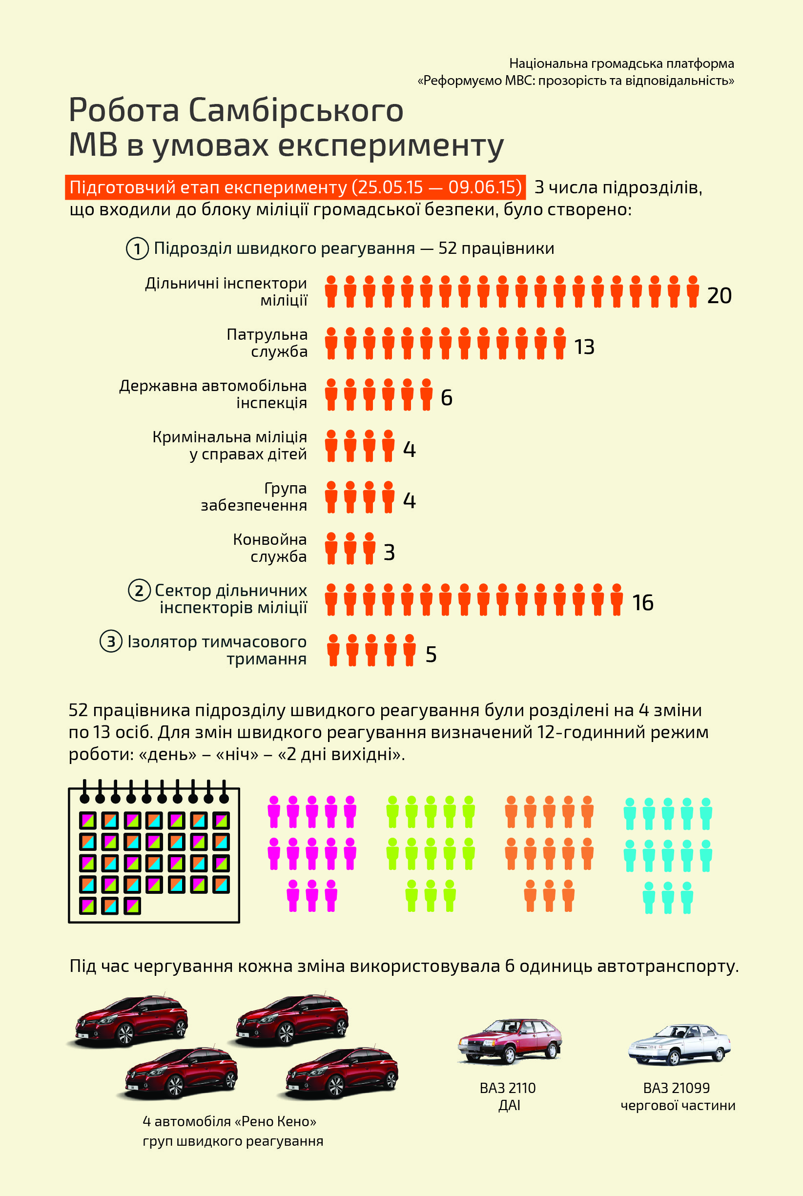 На час експерименту 52 працівники підрозділу швидкого реагування були розділені на 4 зміни (по 13 осіб). З числа найбільш досвідчених та авторитетних працівників служб міліції громадської безпеки (старших дільничних інспекторів міліції) було призначено 4 старших змін. Для змін швидкого реагування був визначений 12-годинний режим роботи: «день» – «ніч» – «2 дні вихідні». Під час чергування кожна зміна використовувала 6 одиниць автотранспорту (4 автомобіля «Рено Кено» груп швидкого реагування (ГШР), 1 автомобіль ВАЗ 2110 ДАІ, 1 автомобіль ВАЗ 21099 чергової частини).