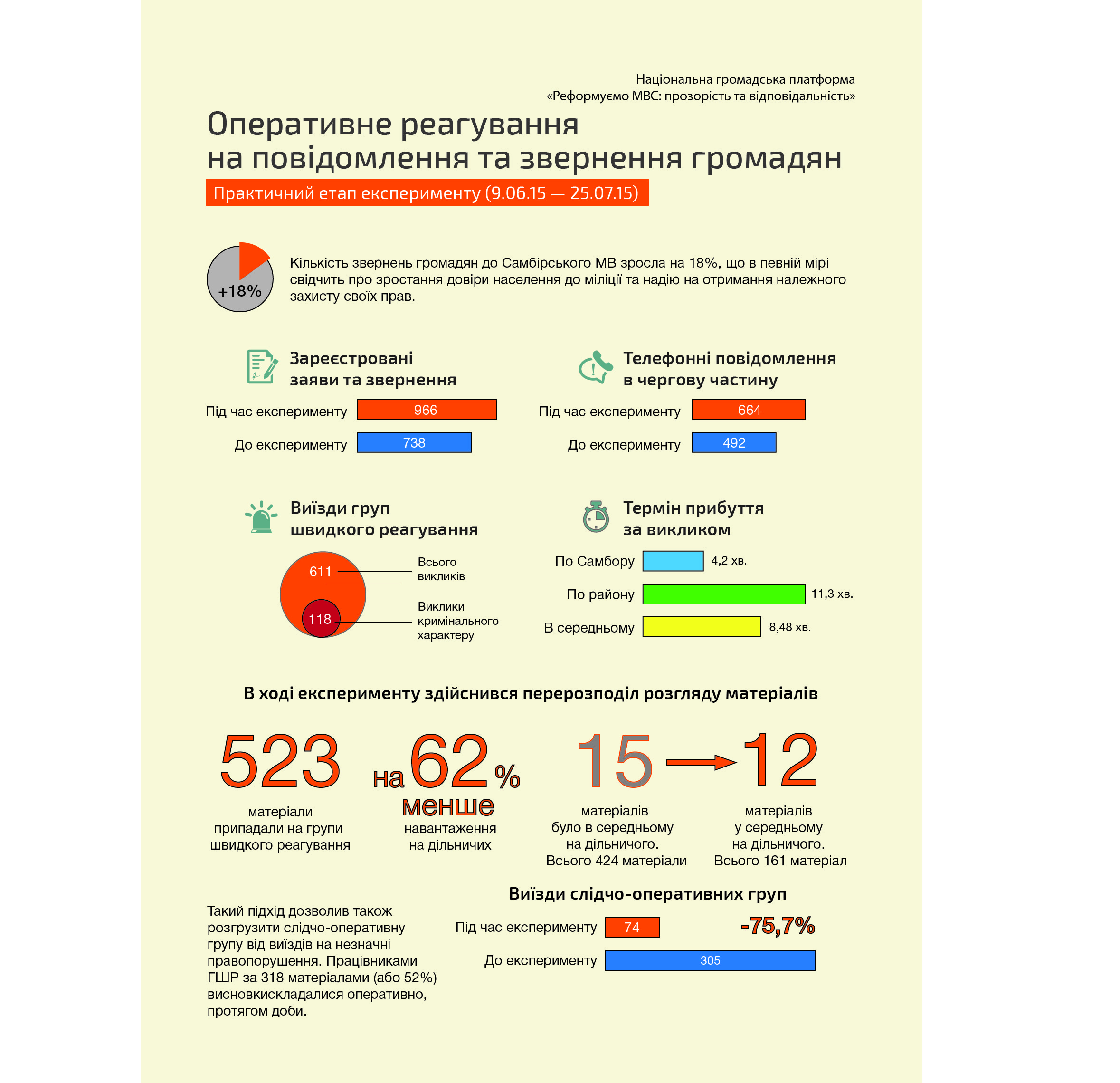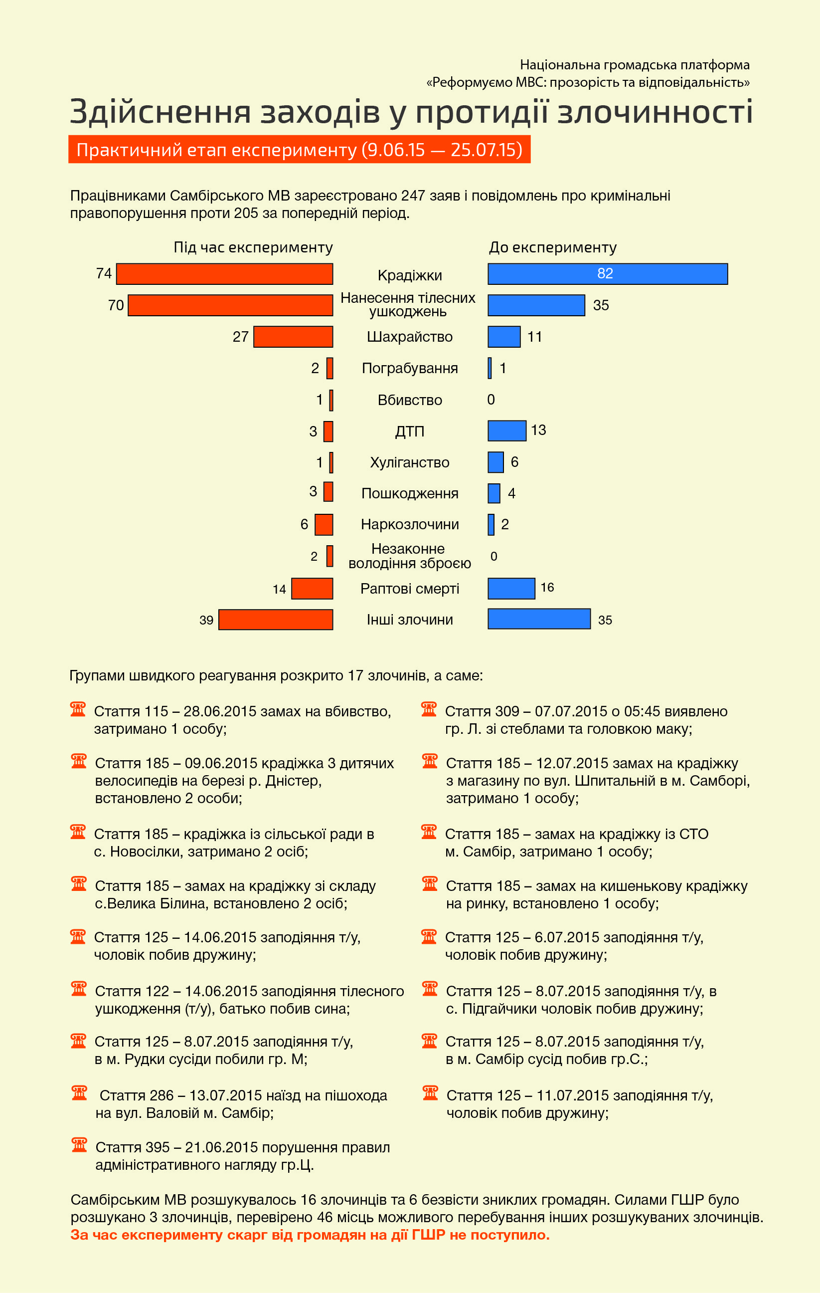 За період проведення експерименту з 9 червня по 21 липня зареєстровано 963 (з них 247 – ЄРДР[1]) заяв і повідомлень. Для порівняння - в період з 28.04.2015 по 09.06.2015 в ЄО[2] було зареєстровано 788 (з них 205 внесено до ЄРДР) заяв і повідомлень громадян. На 25,9% (з 492 до 664) збільшилась кількість телефонних повідомлень в чергову частину міліції.
