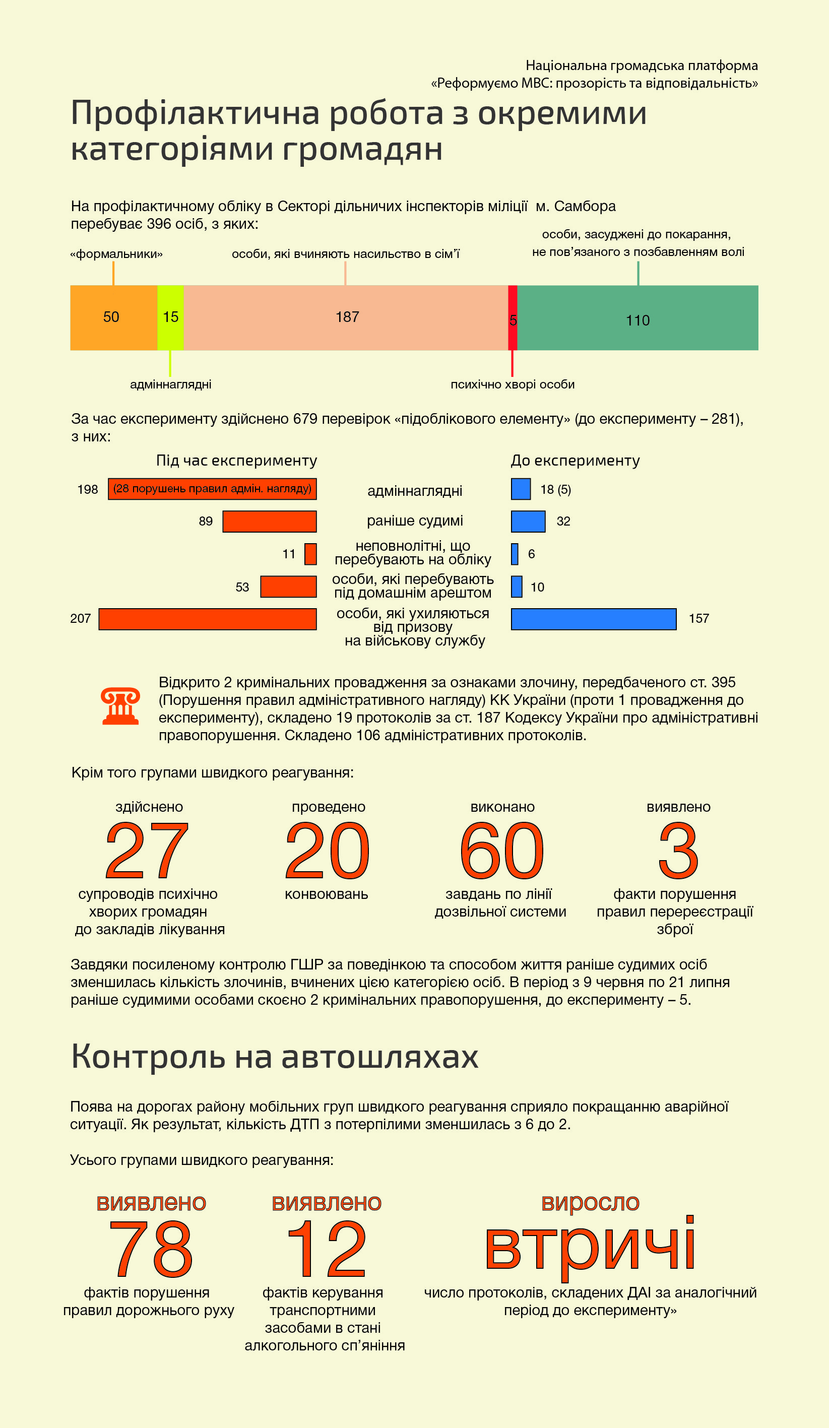 Групи швидкого реагування тісно співпрацюють з іншими підрозділами Самбірського міського відділу щодо організації належного розкриття злочинів. Протидія злочинності набула більш системного і скоординованого характеру. За час проведення експерименту в ЄРДР на території обслуговування Самбірського МВ зареєстровано 247 заяв і повідомлень про кримінальні правопорушення (проти 205 за попередній період), з них: