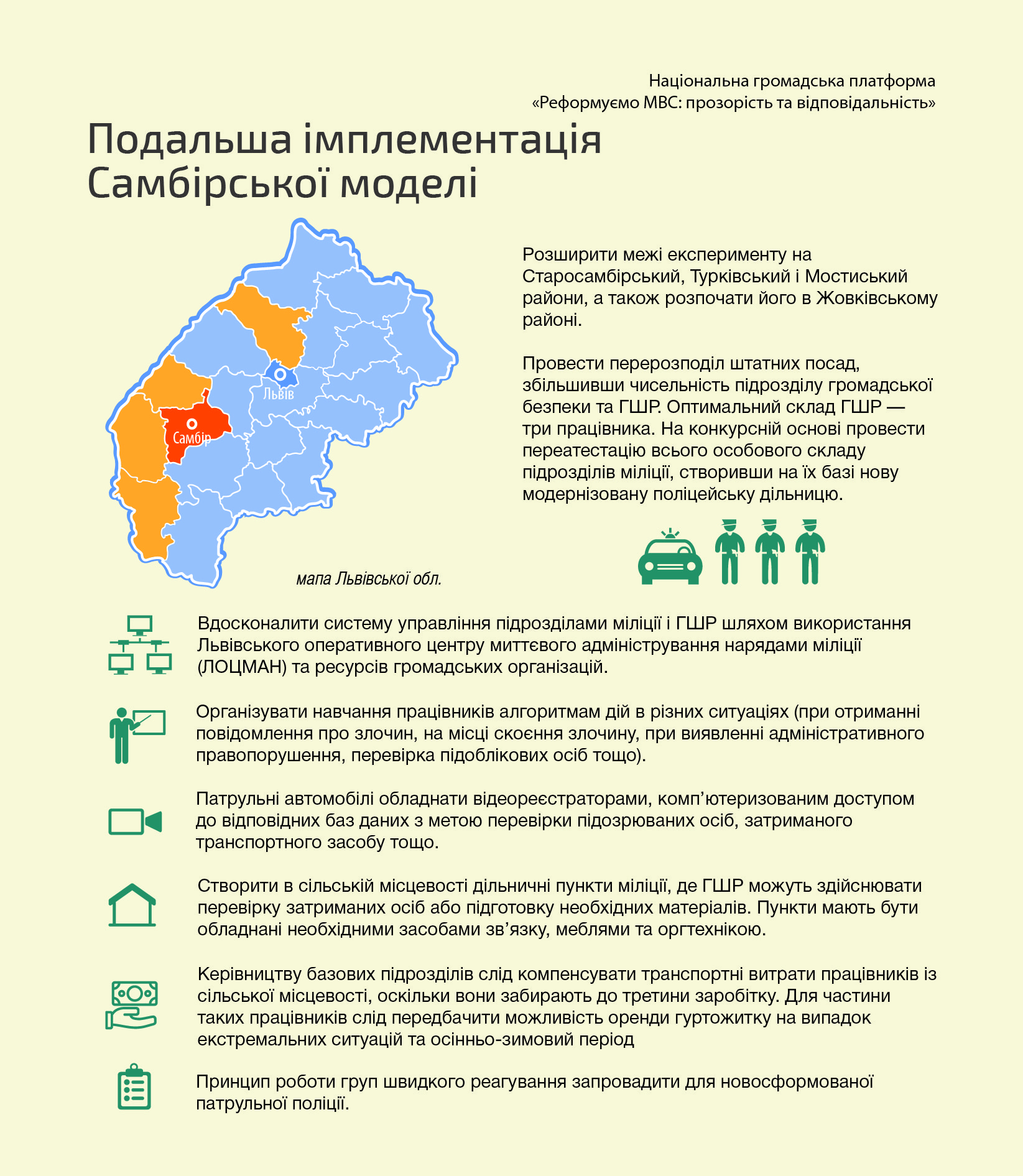 1. У зв’язку з поширенням меж експерименту на Старосамбірський, Турківський і Мостиський райони, враховуючи напрацювання під час проведення експерименту та думку територіальної громади, з метою швидкого та ефективного реагування міліції, назріла необхідність реорганізації Самбірського МВ як базового (враховуючи перспективу адміністративної реформи).