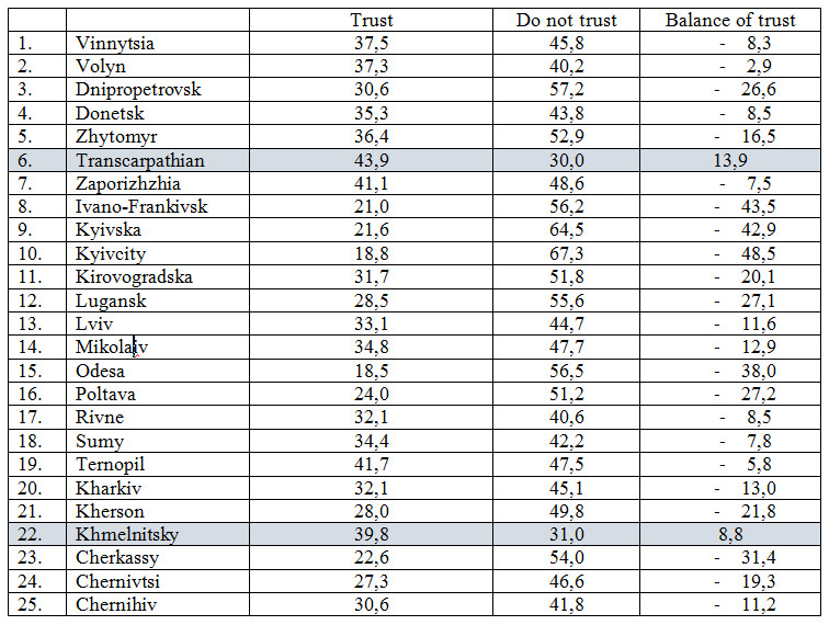 14–15. 30,4 % of respondents trust the police (2,7 % among them fully trust it, and 27,7 % rather trust it than not). 50 % of respondents said that they did not trust the police:29,6 % of them said that they probably do not trust, and 20,4 % do not trust at all. Thus, the police generally has a negative balance of confidence (-19,6 %). At the same time in two oblasts where the police enjoys more trust, the balance of confidence is positive – in Zakarpattia and Khmelnitsky oblasts (see Table15-1).