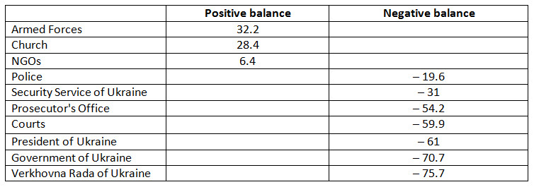 15. BALANCE OF TRUST (RELATIONSHIP BETWEEN THE RESPONDENTS WHO TRUST, AND THOSE WHICH DO NOT TRUST) TO STATE AND CIVIL INSTITUTES (in %)