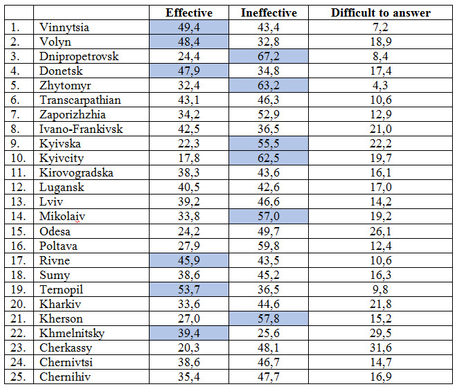 4. A significant number of respondentsassesses the police activity as unsatisfactory. Thus, 49,4 % respondents are not satisfied with the work of local police, and 52,7 % – with the work of Ukrainian police in general. People satisfied with the activity of local police constitute around a third part— 33,7 %, and the persons satisfied with the national police in general – around – 29,5 %. A certain number of respondents could not assess the work of police in general. Although the general opinion on the police efficiency is not very positive, some of respondents in several oblasts assessed it as effective — it concerns Vinnytsia, Volyn, Donetsk, Rivne, Ternopil, Khmelnitsky oblasts. The efficiency was assessed as the worst by the residents of Dnipropetrovsk, Zhytomyr, Mykolaiv, Kherson, Kyiv oblasts and the city of Kyiv (see Table 4-1).
